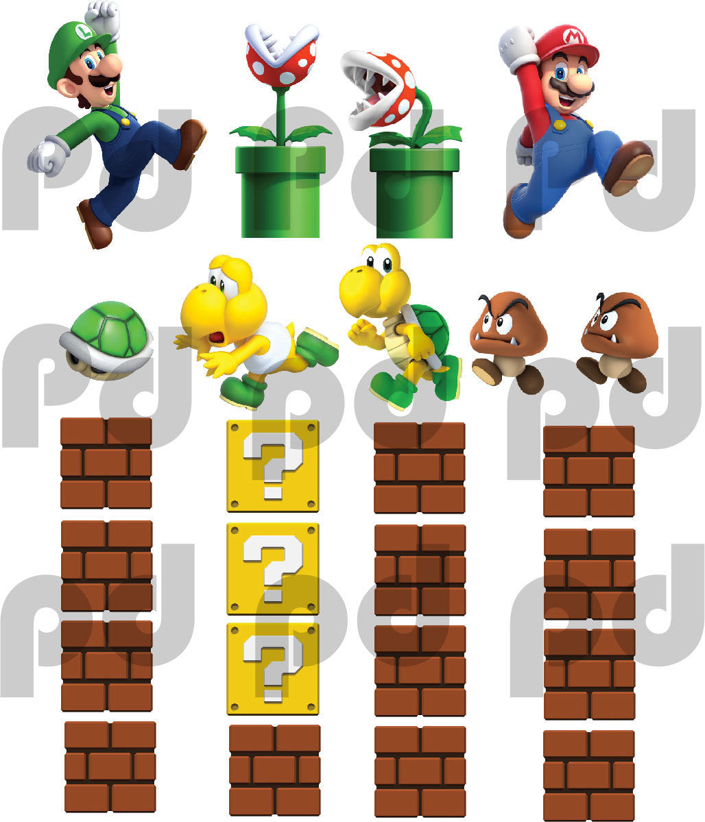49" sheet includes (1) 12" tall Mario, (1) 14" tall Luigi, (2) 9" tall turtles, (2) 6" bad guys, (2) 10-12" plants, (3) 5" question mark boxes, and (13) 5" bricks.